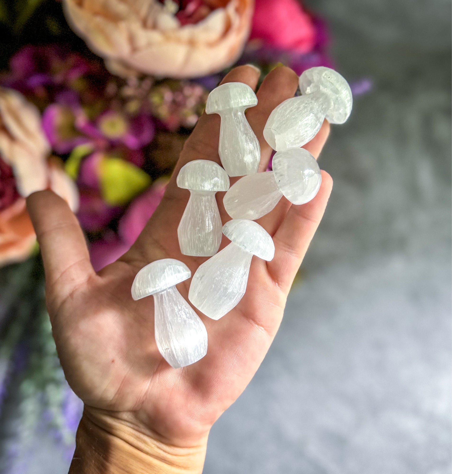 Our 1 3/4" Selenite Mushrooms are tiny treasures straight from a fairy tale! With their soft, glowing appearance, these delightful little mushrooms seem as though they've sprouted from a moonlit forest, where fairies dance and magic lingers in the air. Perfectly sized to sit in the palm of your hand, each selenite mushroom is not only irresistibly cute but also radiates the pure, cleansing energy that selenite is known for. Fairies are said to adore these luminous mushrooms, making them the perfect addition to your mystical collection or as a whimsical gift for someone who believes in a bit of magic.*