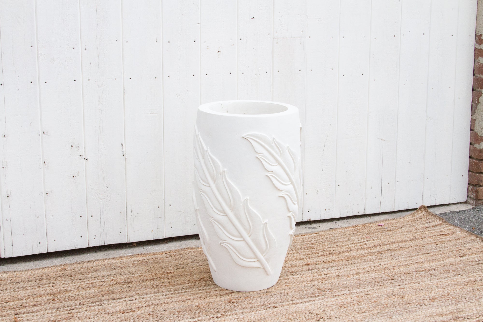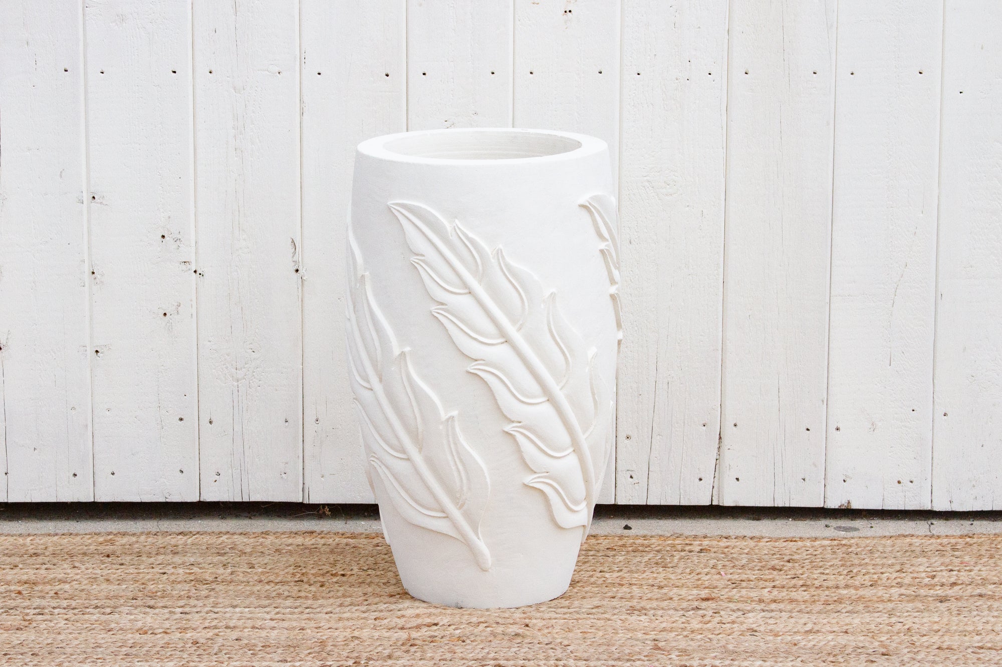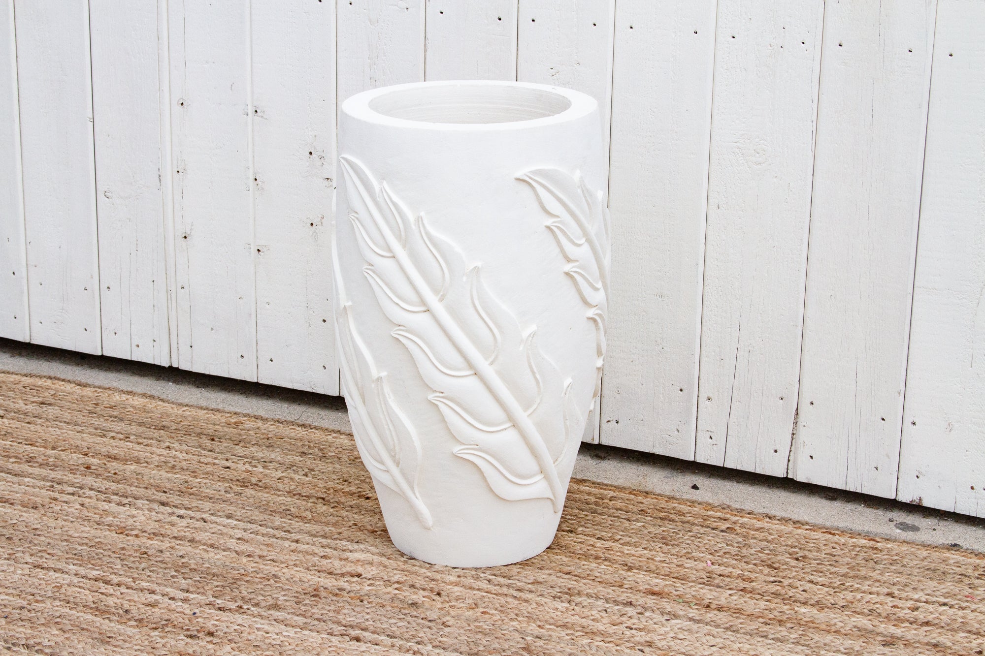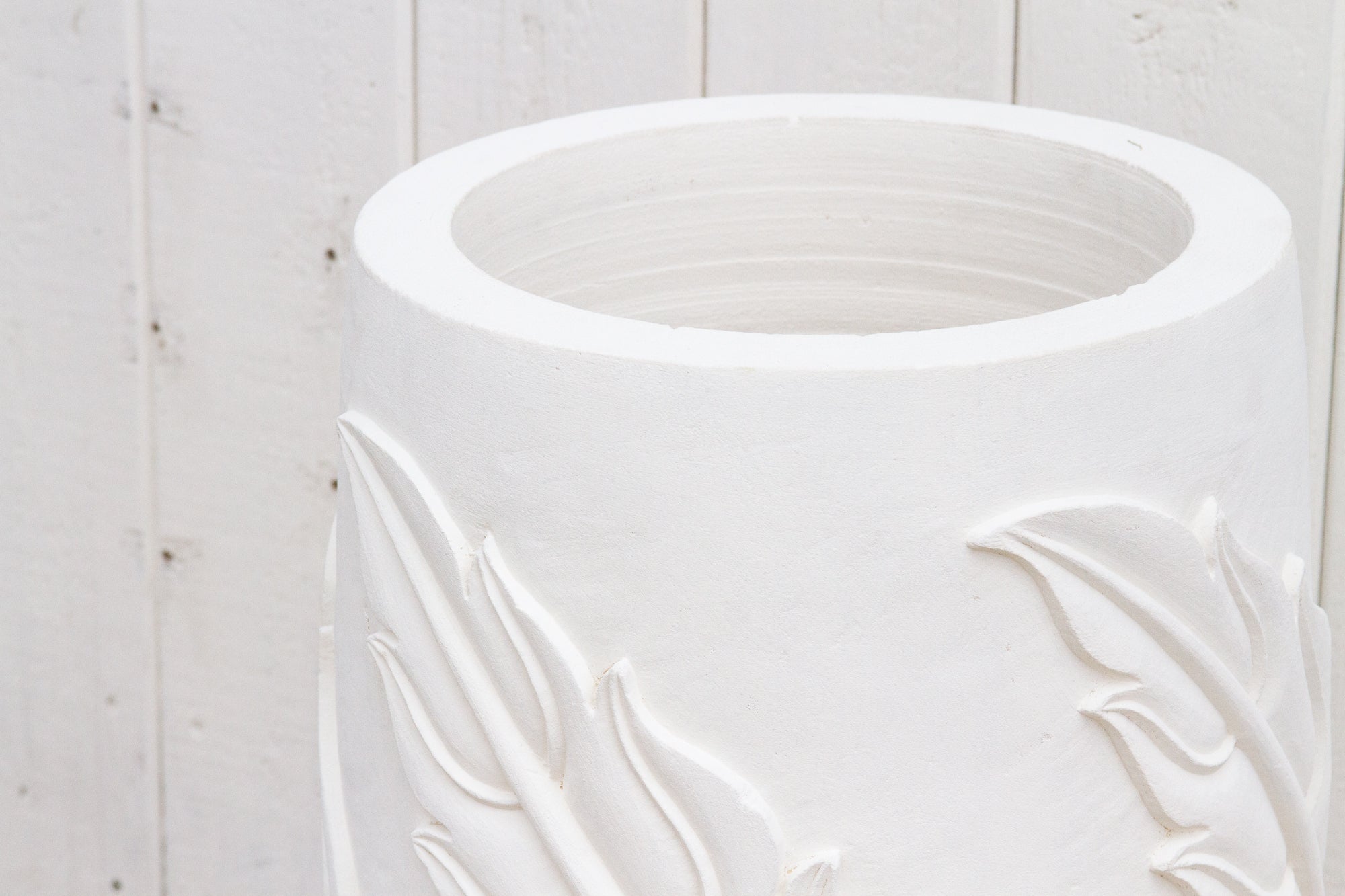A tall outdoor garden planter handcrafted from Karoli sandstone. This planter features an elegant tall shape with an ornate carved leaf design in an unglazed painted white finish. This mediterranean design works well with a modern or farmhouse style decor and the white will contrast beautifully with any greenery added to it. This planter does not have a drainage hole at the bottom of its base.