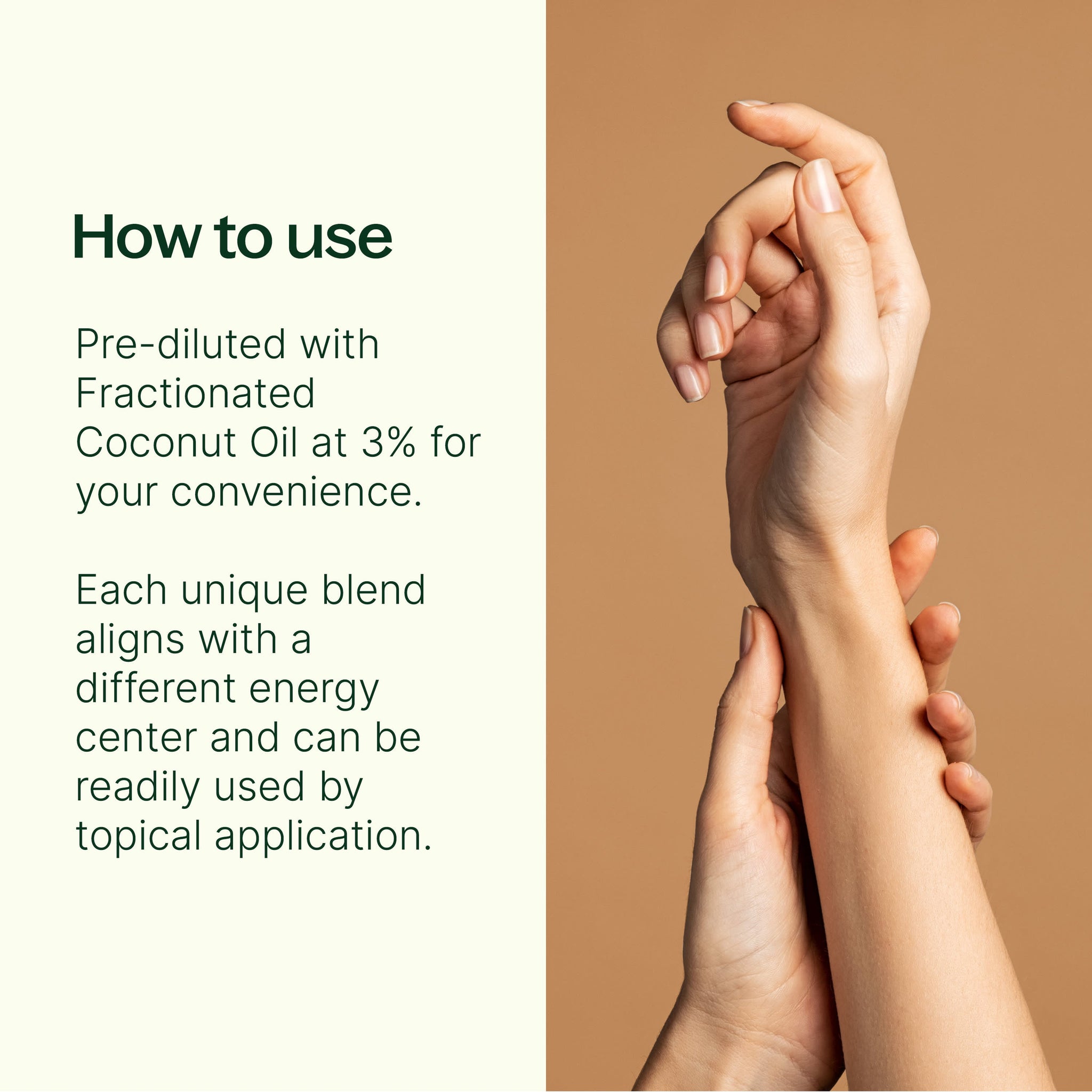 Plant Therapy has created a special line to help balance the 7 major chakras of your natural energy system in our Chakra Roll-On Set. Chakras are subtle energy centers that intersect with our mind, body, and spirit. These chakras are located along our spine in ascending order from base to crown. When our chakras are in balance our natural energy flows smoothly creating a sense of overall well-being. Use these essential oil blends when you want to incorporate self-balancing rituals into your self-care routine. These blends were created with the intention to support balance in each of the individual chakras while providing a gently inviting and accessible experience. We recommend you use these blends at much less intensity than used for the mind and body in order to resonate, rather than overwhelm, the subtle nature of our energy.