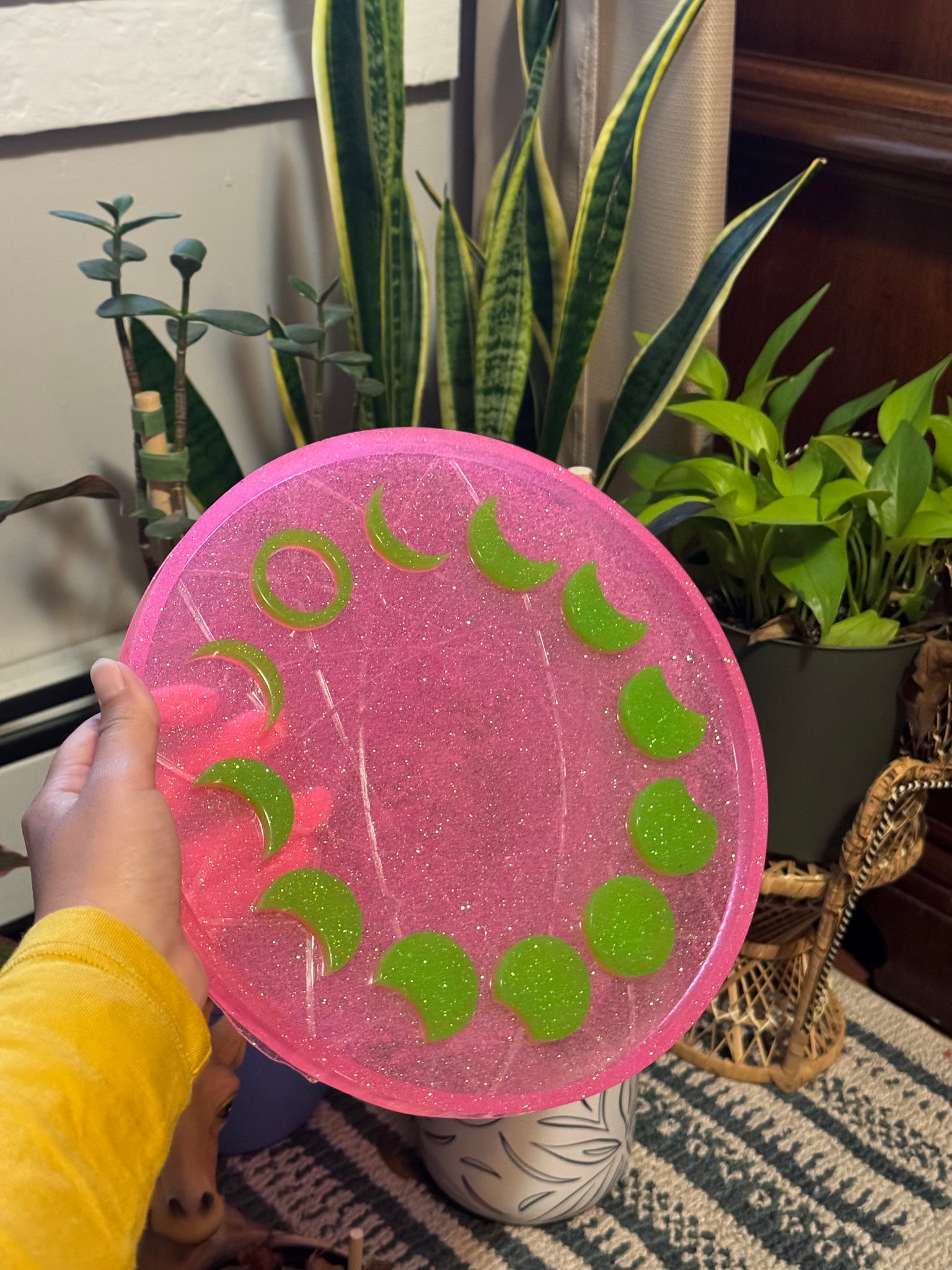 Each tray features the full lunar cycle, intricately crafted with shimmering resin and dreamy swirls of color.